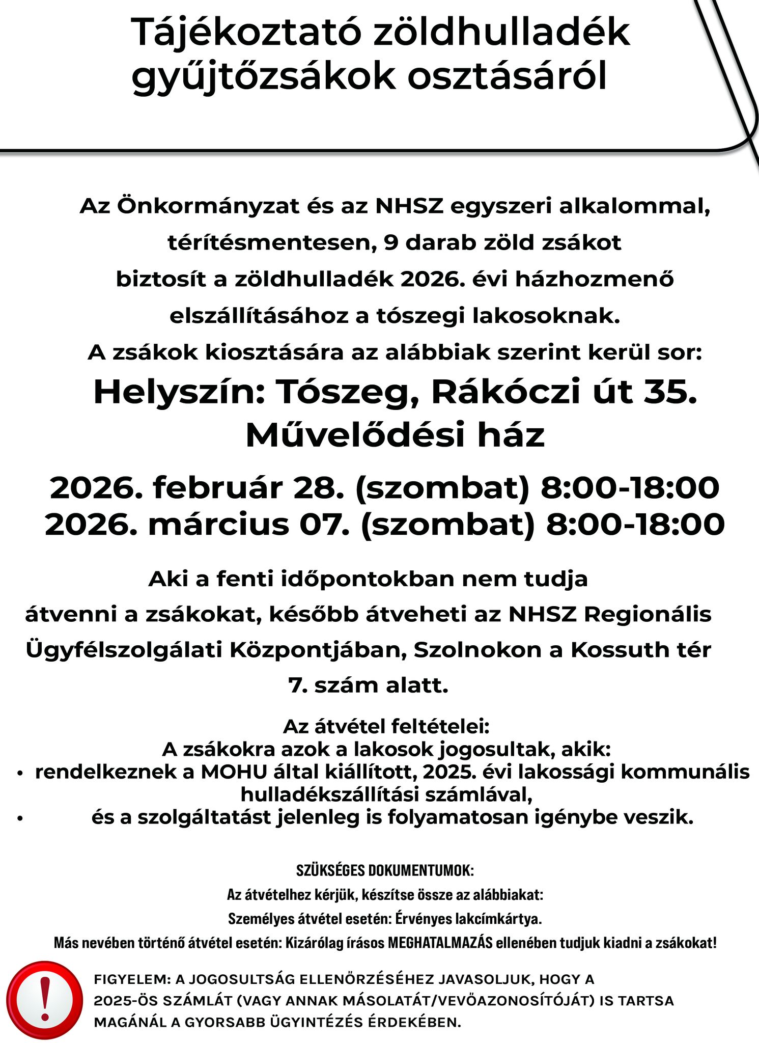 Az Önkormányzat és az NHSZ egyszeri alkalommal, térítésmentesen, 9 db zöld zsákot biztosít a zöldhulladék 2026. évi házhozmenő elszállításhoz a tószegi lakosoknak..